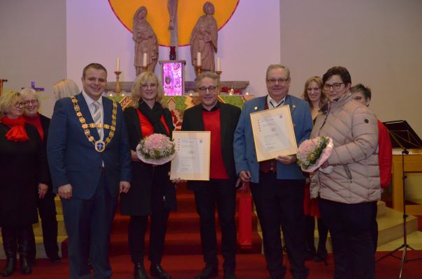 Unserem Vorsitzenden, Herrn Jürgen Pappert, wurde dann in diesem Rahmen der Ehrenbrief des Landes Hessen für seine langjährigen Verdienste in seinem Amt verliehen. Auch singt er bereits seit seiner Jugendzeit und das wohl immer noch sehr gerne, der Bass braucht ihn! Doch sei dies alles nur möglich, so der Bürgermeister, wenn man Unterstützung durch die Familie erhält. Um auch dies zu würdigen, erhielt Simone Pappert einen Blumenstrauß.